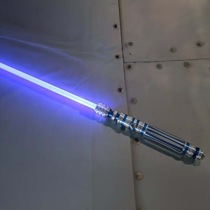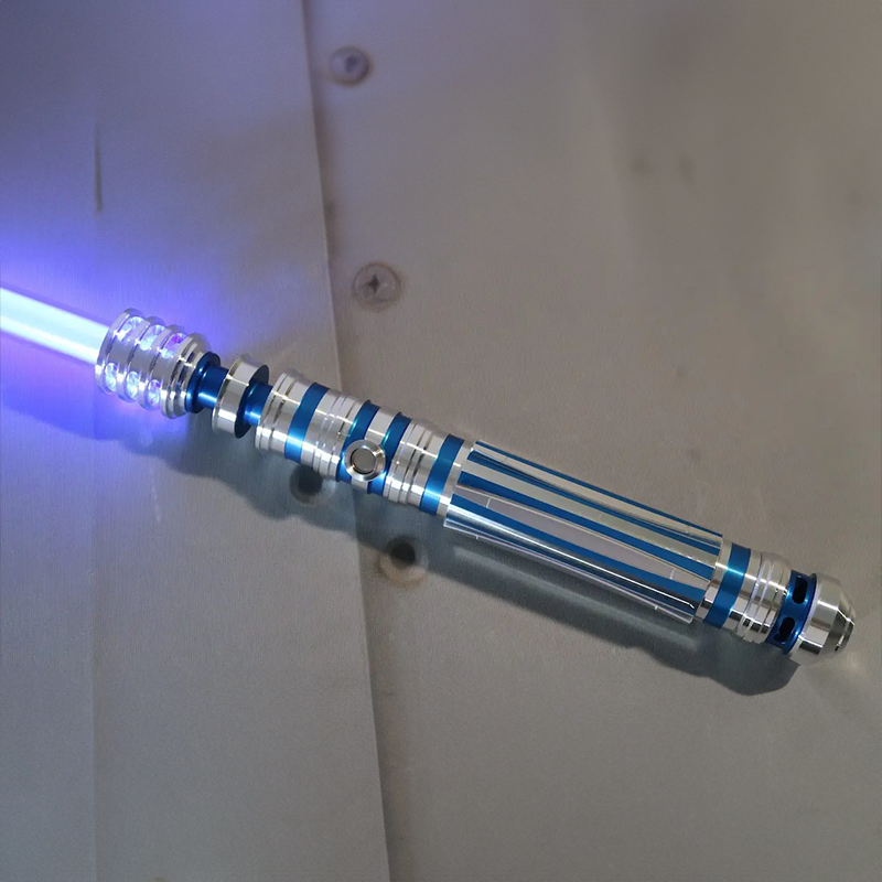 We knew the Azure Princess needed to flourish in combat so we included a number of choke-points below the thin-neck that give the wielder several options to position a main hand for quick spins and fast-paced combat. We crafted the Azure Princess to be light enough to be wielded comfortably with a single hand while being long enough for a comfortable grip with a second hand to accommodate various combat styles. The grip of the Azure Princess features a new ridged design, with anodized accents that match colors across the emitter and pommel.