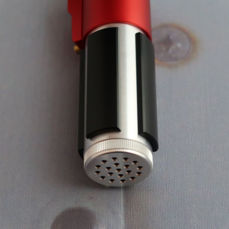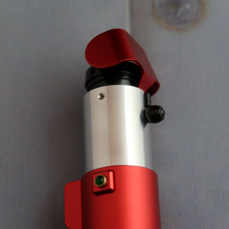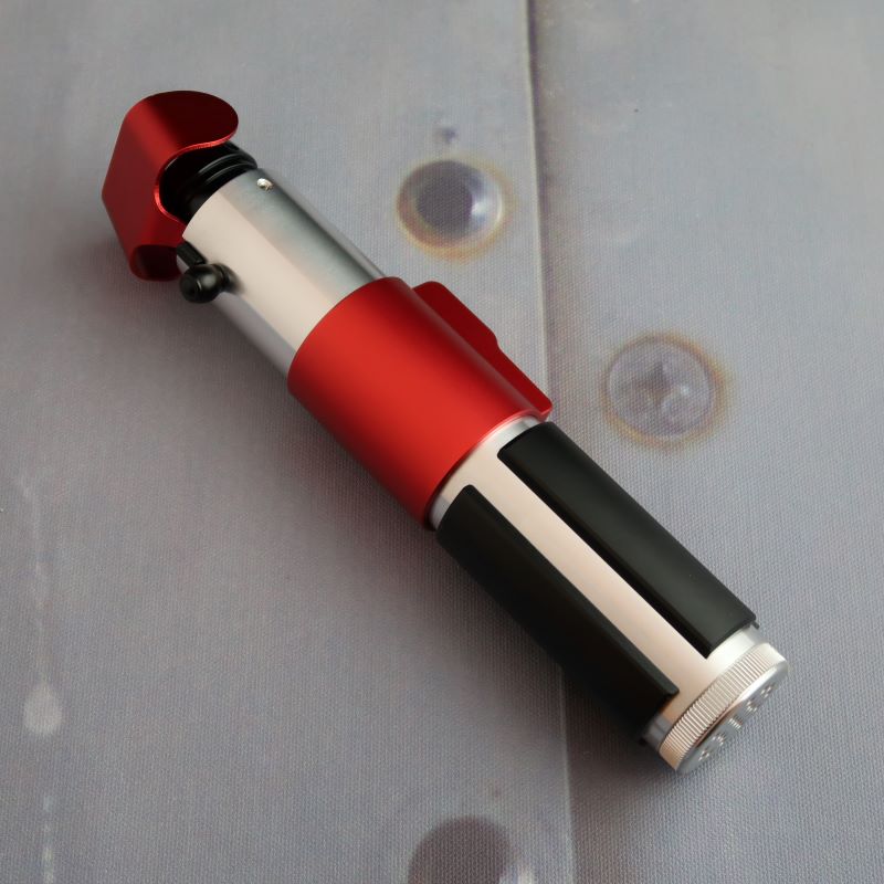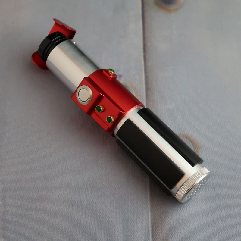 With a shrouded emitter protecting the base of the blade, and jeweled knobs that give it an elegant look, it is perfect for wizened masters and padawans alike! The vented pommel with pinholes matches its stature and allows for beautiful sound. The grips paired with the sleek activation box make this hilt incredibly comfortable to wield.