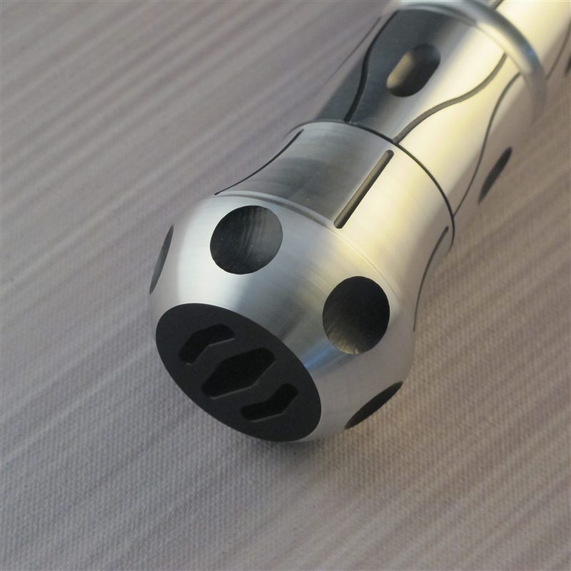And then to set the entire saber off is the amazing emitter. The design and machining job on the emitter is absolutely awesome. The claws are firm and secure and provide a very unique looks to the entire saber with how they are mounted. The emitter comes with a front and a back disc that act as huge red color filters allowing light to pass through them for added flare. You can also get these discs with the cat design, eye design, or blank to match your taste. NO ONE is going to overlook you with this bad boy hanging from your belt or being wielded in your hands. This saber stands out and will gain all the attention it deserves.