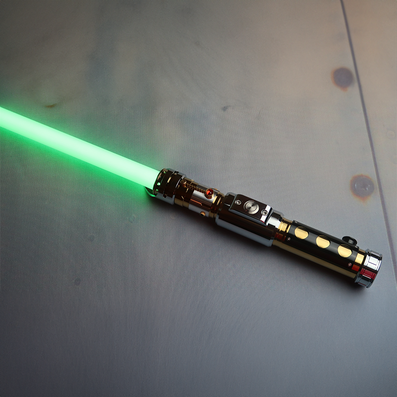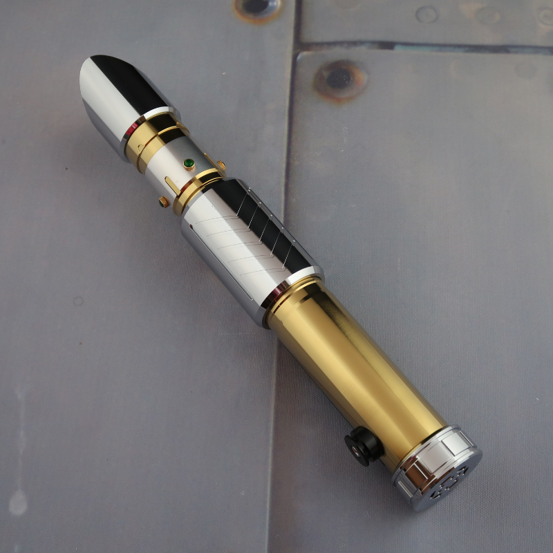 This lightsaber is available in two beautiful finishes, the Deceived with a gold and silver finish with black accents and silver pommel, and the Dark Deceived with a gold and black finish with a silver activation box and gold pommel.