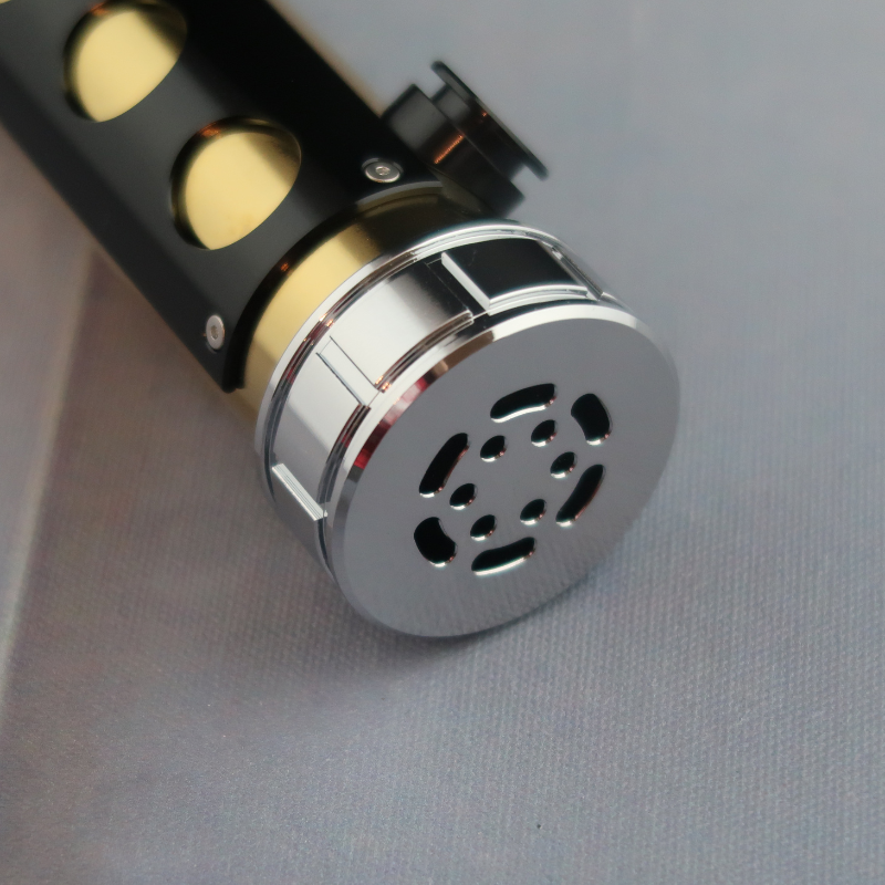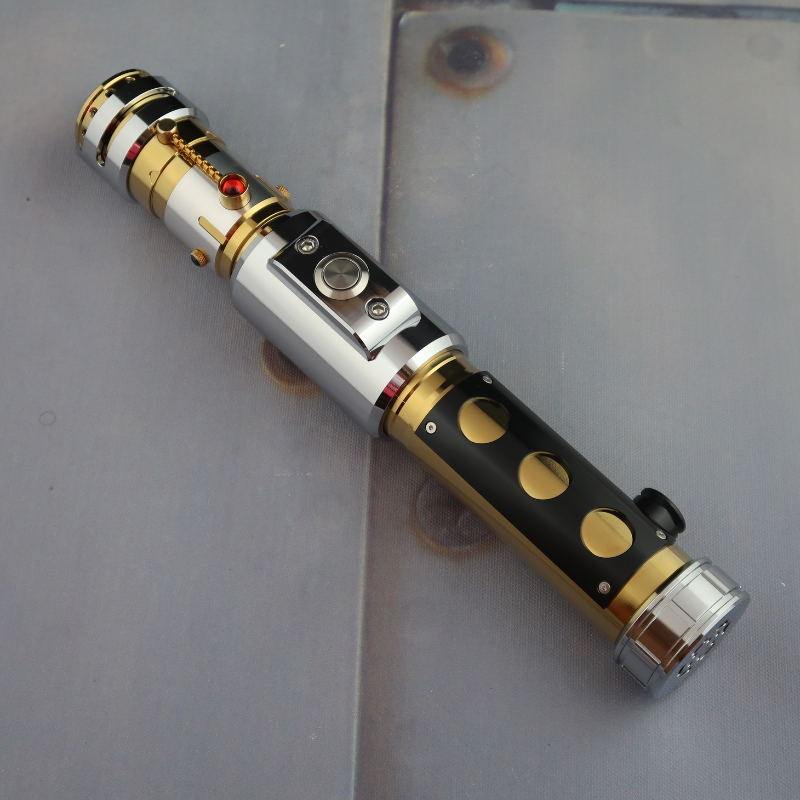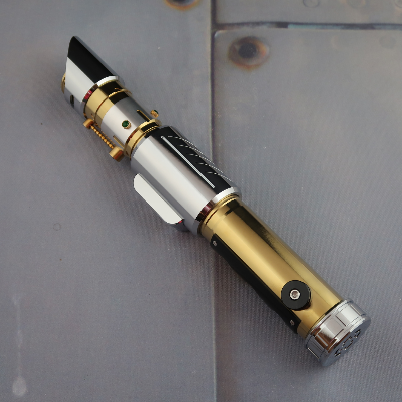 Whether you are a collector, a cosplayer, or a fan of elegant weaponry, this opulent saber is sure to captivate your imagination. Its combination of gold, silver, and black, along with the intricate detailing and gem accents, make it a true work of art. Embrace the allure of this saber and add a touch of luxury to your collection or cosplay ensemble. The Deceived comes with a ring of pinhole windows in the inner part of the angled emitter, and a Belt Clip Wheel comes standard.