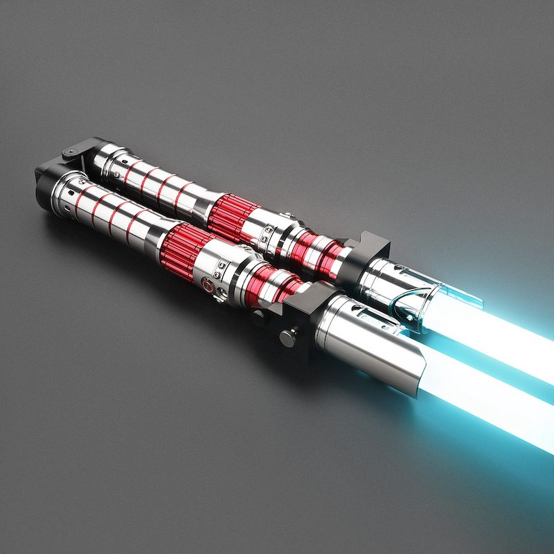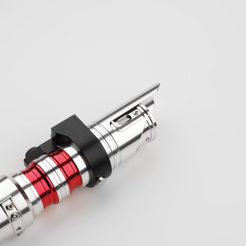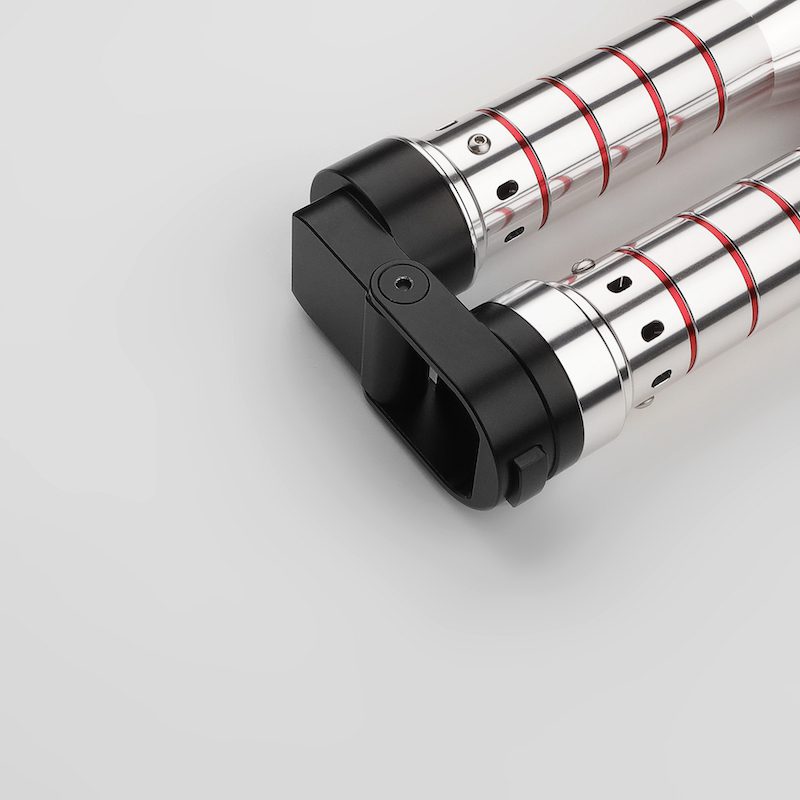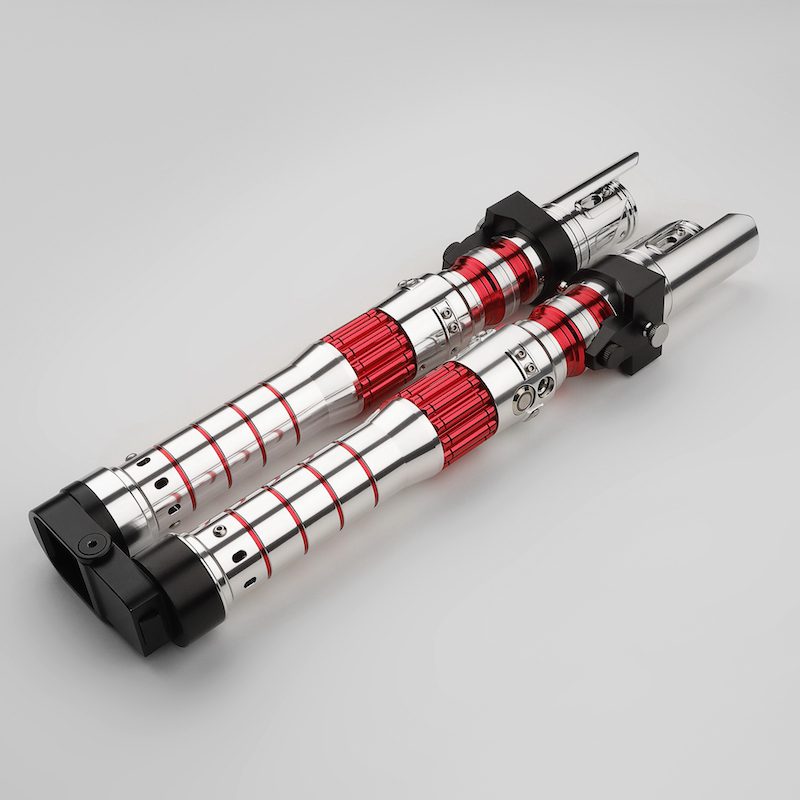 We've made double bladed lightsabers before, but the XenoPixel Empress Staff takes it to a whole new level..! This is one of the most unique designs we've ever seen. The XenoPixel Empress Staff is two comfortably balanced, full-sized sabers that sit parallel, joined by an adjustable hinge-coupler that allows the sabers to swing open into a full-sized staff! The beautiful, machined aluminum has been polished to a brilliant shine, and features bands of a fierce red anodizing across both hilts. The twin hooded emitters are positioned to be facing one another, and are decorated with windows on each side, giving an added sinister look.
