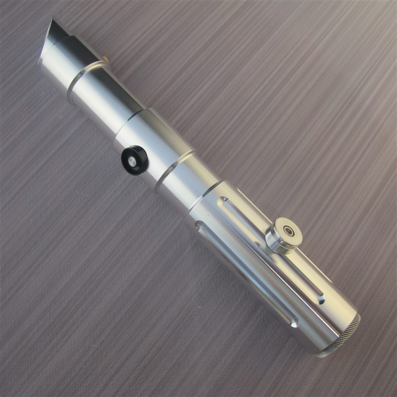 The Prophecy is a premium stunt saber masterfully crafted from aircraft grade aluminum. It comes complete with full sized blade, brass retainers, threaded MHS compatible pommel, and a custom machined aluminum belt clip wheel specifically created for this saber. The grips were designed for excellent tactile feedback and control. The switch is guarded and recessed into the hilt for optimum performance and durability. And of course, since this is a V3 this saber is now sound capable!