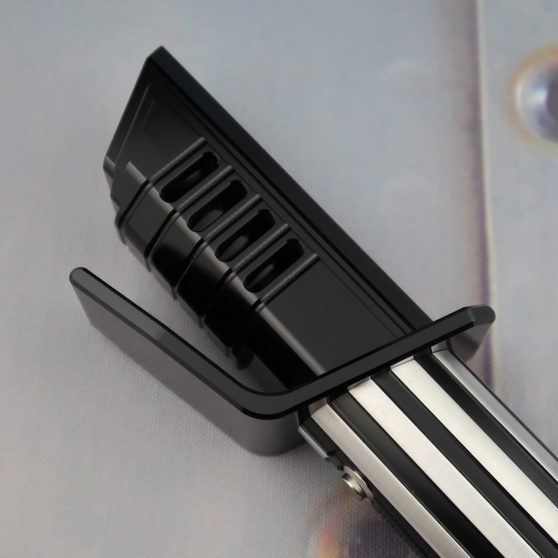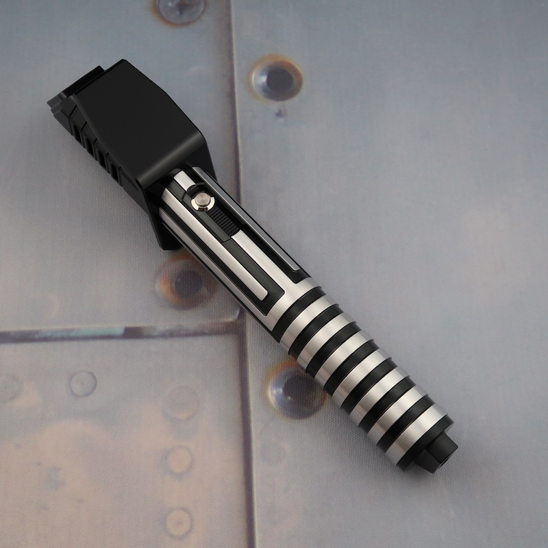 The Darksaber LE v2 features the black anodized hilt being machined back to reveal silver in the paneling and grooves of the saber.