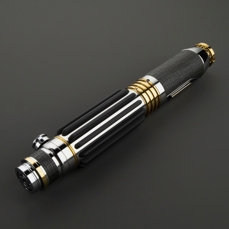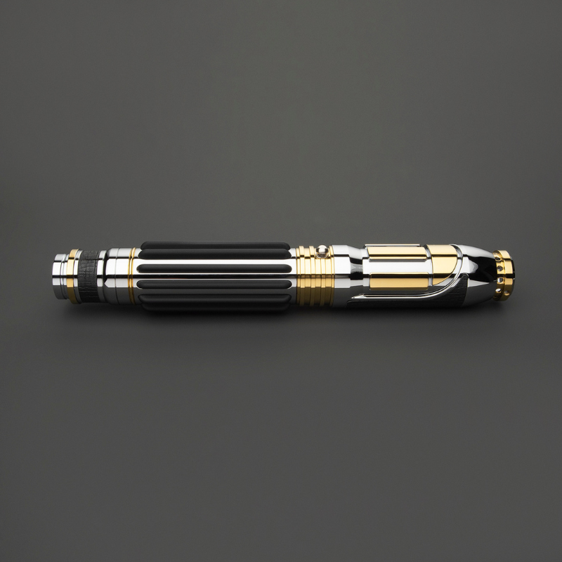 The Xeno DP Electrum is a lightsaber that combines intricate design with standout visual impact. Its silver hilt is accented with detailed gold elements and paired with black grips and leather highlights for added texture. Pinhole windows in the emitter create a captivating glow when the blade is ignited, making the DP Electrum a striking centerpiece for both display and action.