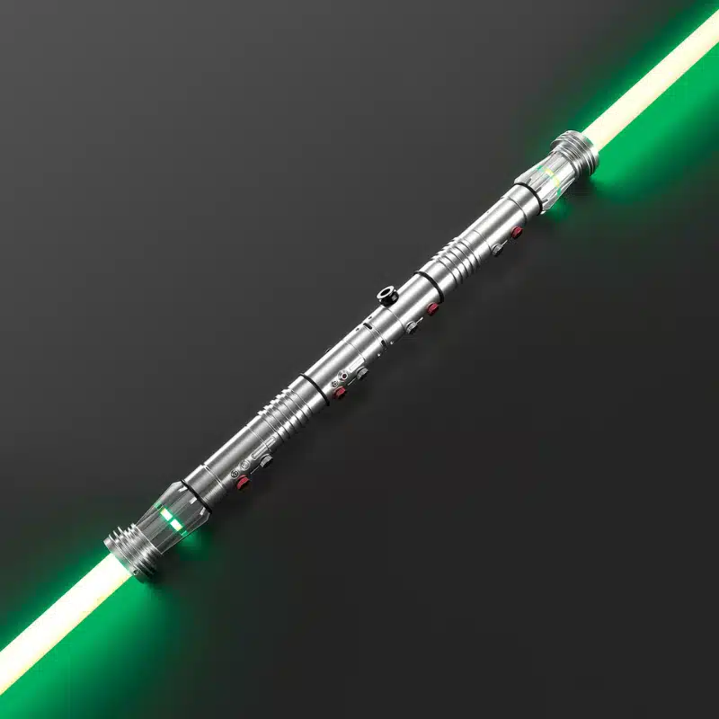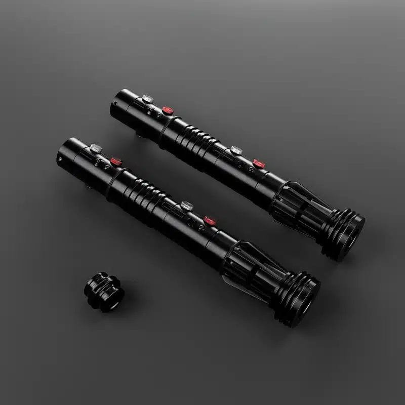 This saber can be used as a double-bladed staff or separated into two hilts for dual-wielding. The crowned emitter features windows that emit an ominous glow, while the body is accented with decorative red and silver buttons, combining style with functionality.