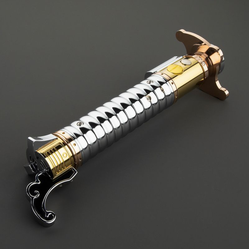 The Xeno DP Ronin is a lightsaber designed to impress with its striking design and craftsmanship. Its distinctive emitter and pommel draw the eye, while the polished Gold and Silver finish gives the hilt a bold, radiant presence. Expertly crafted with attention to detail, the DP Ronin is a standout addition for collectors and duelists seeking a saber that combines style, performance, and distinction.
