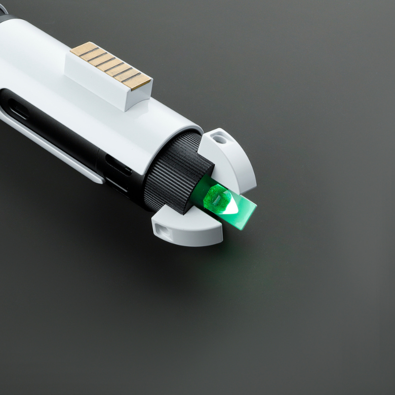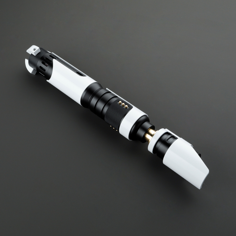 Introducing a saber of unparalleled uniqueness, featuring a sleek white and black body with a slender copper neck and intricate details. This saber is designed to withstand the rigors of battle, even if it misses a few shots here or there. The pommel is adorned with a crystal that emits a glow matching the color of the blade, adding a touch of elegance to its overall design. Additionally, the emitter is angled in a manner that shields it from potential foes, ensuring maximum protection during combat. This saber is a must-have for any discerning warrior seeking a combination of style and functionality.